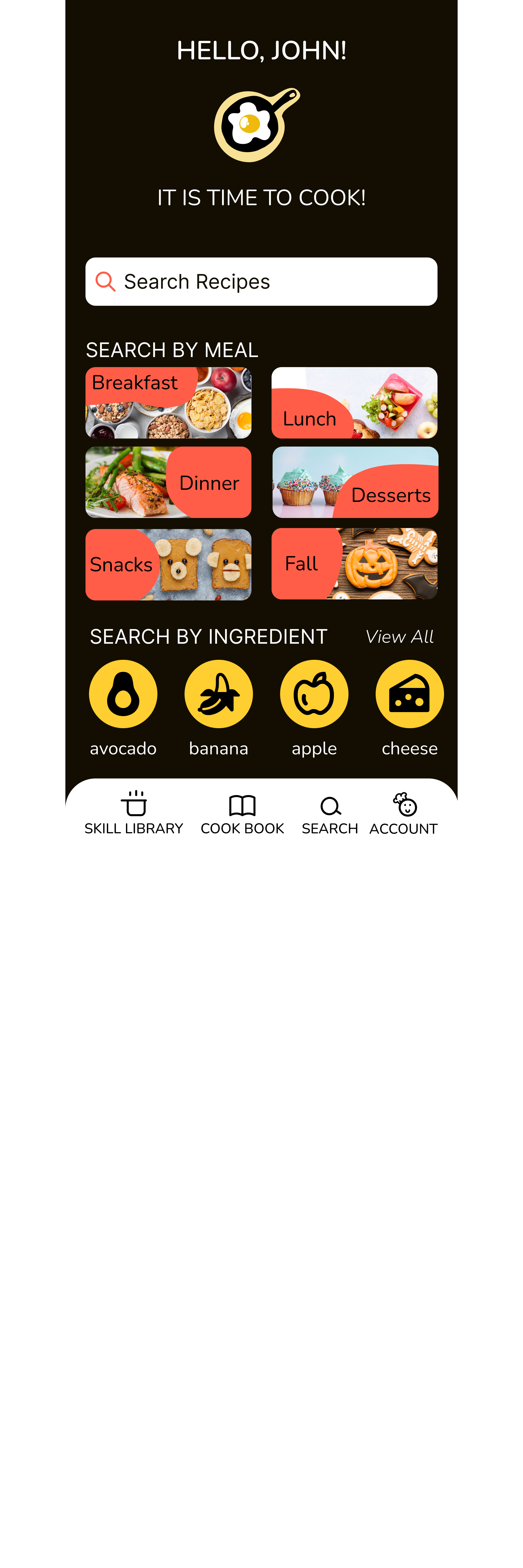 Once the wireframes for the kids' cooking app have been established, the next step was to infuse a vibrant and engaging visual system that enhances the overall user experience. I chose vibrant color palette with cheerful yellows and warm reds to evoke a sense of excitement. I also utilized large, rounded buttons adorned with intuitive icons to facilitate interaction, ensuring that the design is accessible and user-friendly for young children.